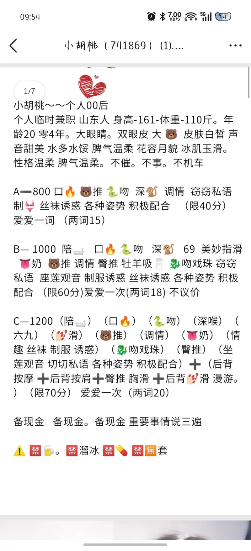 前几天闲来无事打开微信附近,找到这个小七,问完价格和服务驱车前往,到楼下遥控上楼,十分安全。打开门看见小七惊呆,妹子非常非常嫩!妹子非常非常嫩!妹子非常非常嫩!重要事情说三遍。进门之后聊了一会得知妹子最近缺钱才做一小段时间的,然后去洗了洗,躺床上妹子开始服务,小舌头非常灵活,全身漫游简直爽爆。脱下妹妹衣服,奶子还是粉色的,边摸小七奶子,小七边给我口交,差点没忍住交出来了。跟妹妹商量了下,开始69,妹妹很温柔像小女友一样,看到妹妹小穴十分的粉嫩,应该刚下水没做过几次,没忍住开始舔了会儿。实在忍不住开始带上小雨伞挺入,小穴很紧差点没把持住射出来了,大战几百回合交了货,歇了会继续开战,射了三次,洗了洗就撤退了。这个年龄外形对应这个价格是挺值的,喜欢可爱嫩的赶快抓住机会体验,免得妹子不做了只剩后悔了!